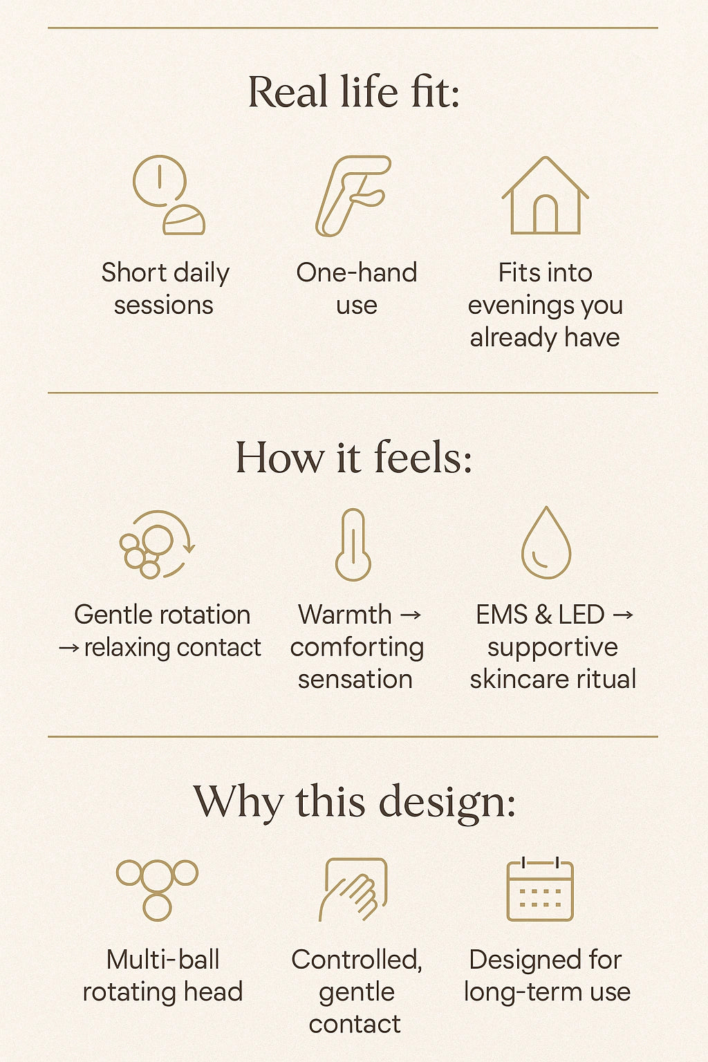 This device is intended for cosmetic skincare support only. It does not replace professional or medical treatments, but it can support a personal ritual focused on care, comfort and consistency over time.