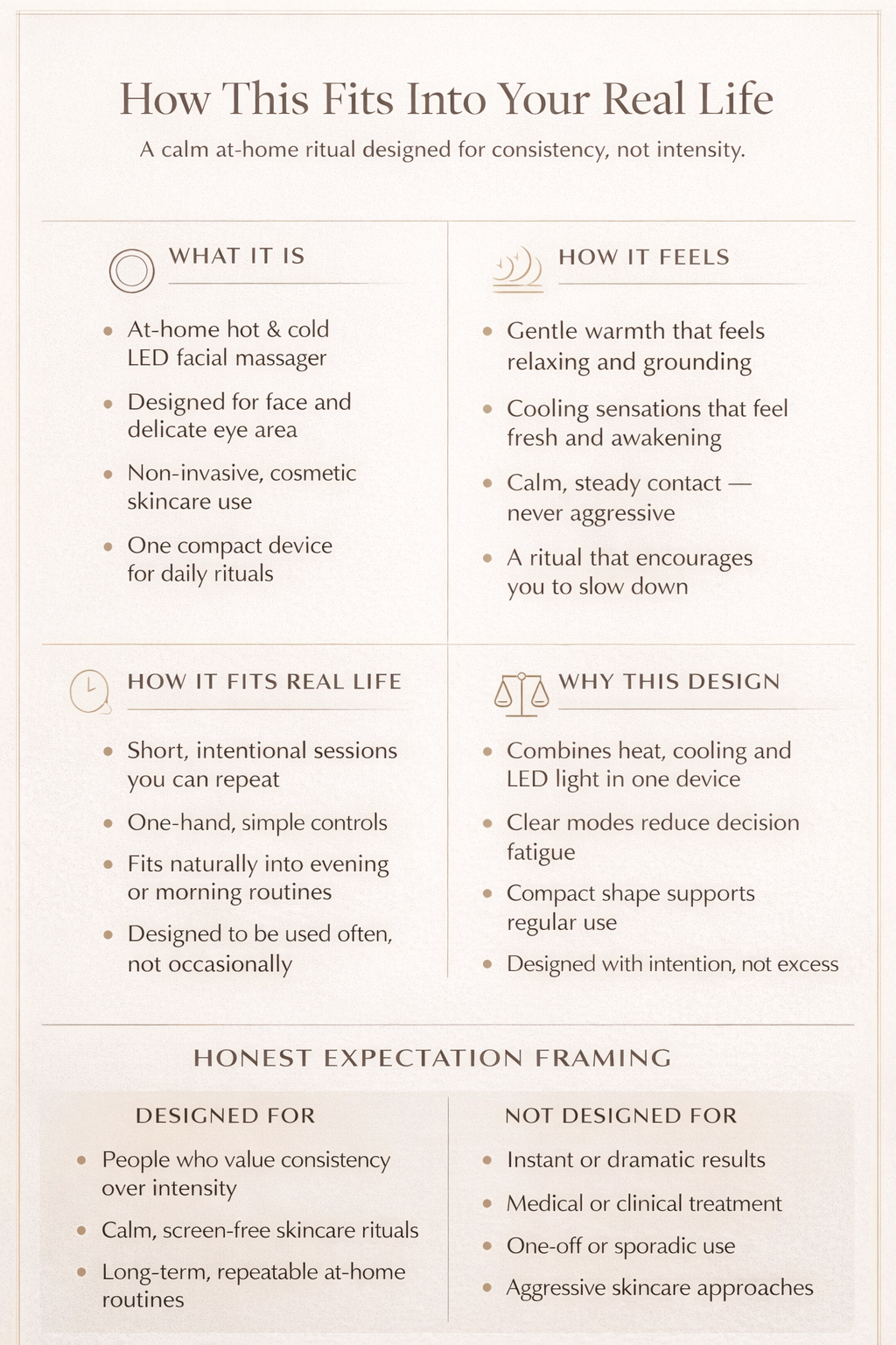 This hot and cold LED facial massager fits naturally into routines you already have. Use it in the evening with your usual serum or cream, or in the morning as a short wake-up ritual for the face and eye area. The device is rechargeable, cordless, and designed for repeated long-term use rather than single-use treatments.