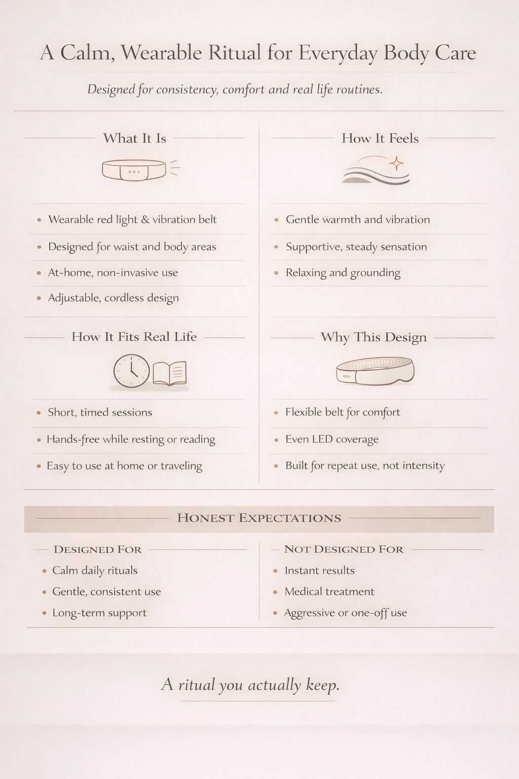 Noélune Red Light Therapy Belt is an at-home red light therapy device designed for the waist and surrounding body areas. It combines visible red light and near-infrared light with gentle vibration in a flexible, wearable format that supports calm, repeatable body care routines.