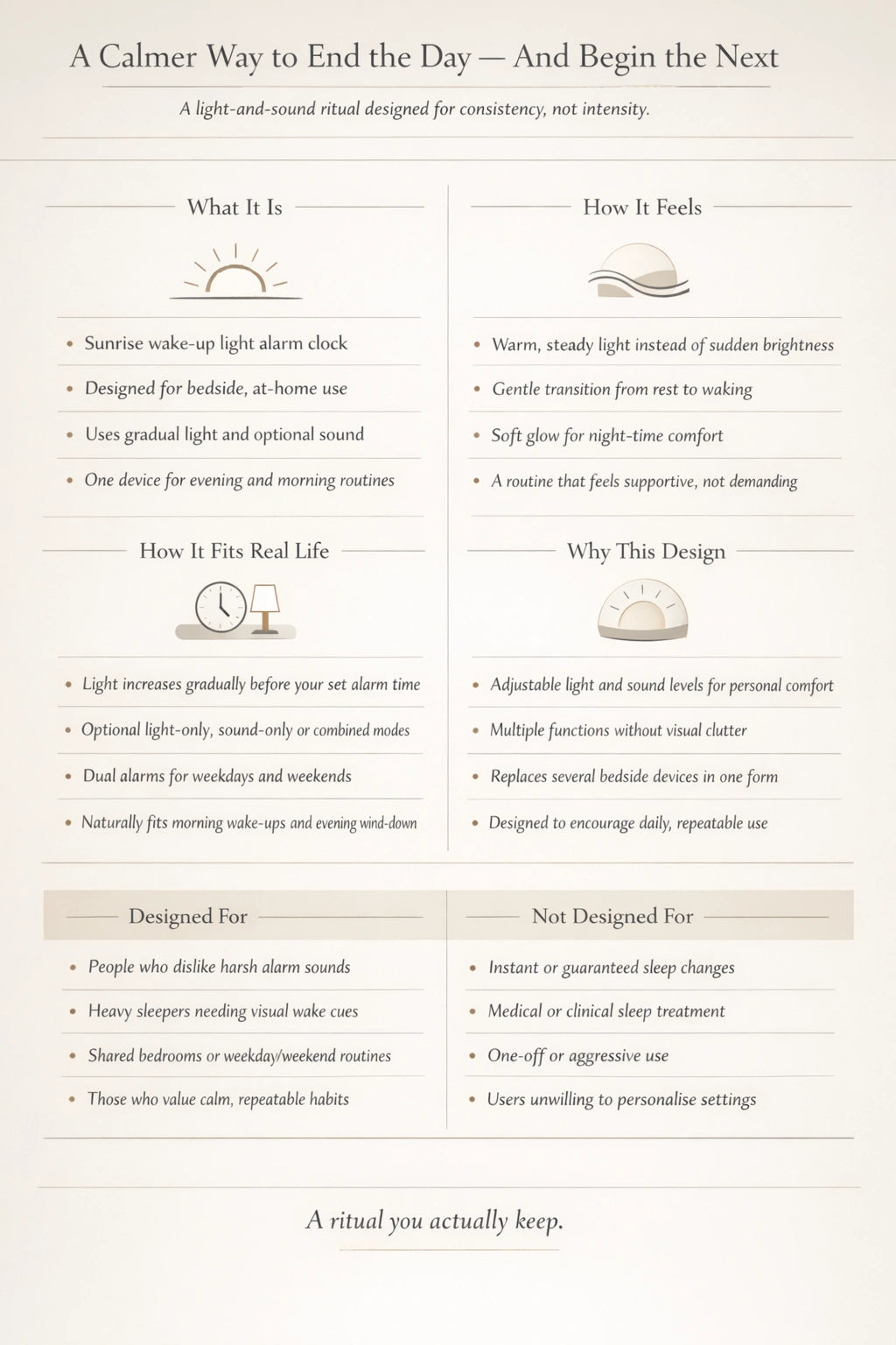 As a bedside lamp, night light and sleep sound machine in one, this wake-up light alarm clock reduces clutter and simplifies your sleep setup. It’s designed to become a long-term ritual you actually keep, rather than another unused device.