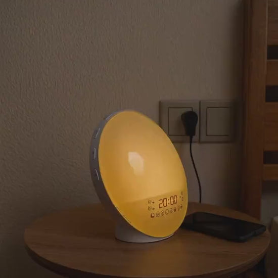 The Noélune sunrise wake-up light alarm clock is designed to support calmer evenings and more natural mornings through light and sound rather than shock alarms. As a sunrise wake-up light, it gradually increases brightness before your alarm time, helping your room feel brighter and more awake before sound begins.